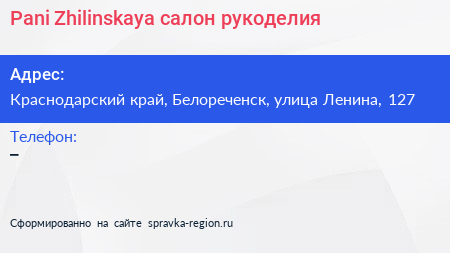 Pani Zhilinskaya, салон рукоделия по адресу Краснодарский край, Белореченск, улица Ленина, 127 в дальнейшем Организация, размещена в следующих категориях: