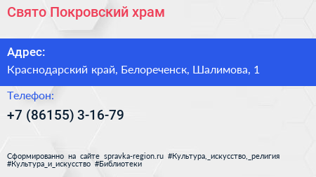 Свято-Покровский храм по адресу Краснодарский край, Белореченск, Шалимова, 1 в дальнейшем Организация, размещена в следующих категориях:
