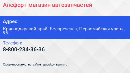 Алсфорт, магазин автозапчастей по адресу Краснодарский край, Белореченск, Первомайская улица, 95 в дальнейшем Организация, размещена в следующих категориях: