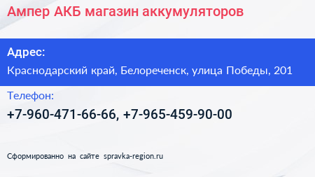 Ампер-АКБ, магазин аккумуляторов по адресу Краснодарский край, Белореченск, улица Победы, 201 в дальнейшем Организация, размещена в следующих категориях: