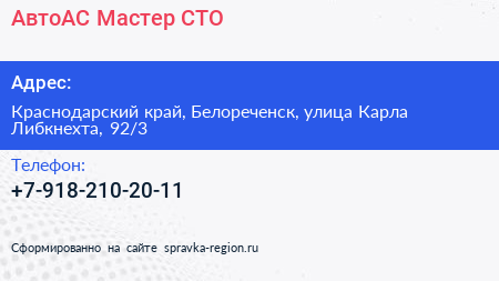 АвтоАС-Мастер, СТО по адресу Краснодарский край, Белореченск, улица Карла Либкнехта, 92/3 в дальнейшем Организация, размещена в следующих категориях:
