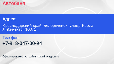 Автобаня по адресу Краснодарский край, Белореченск, улица Карла Либкнехта, 100/1 в дальнейшем Организация, размещена в следующих категориях: