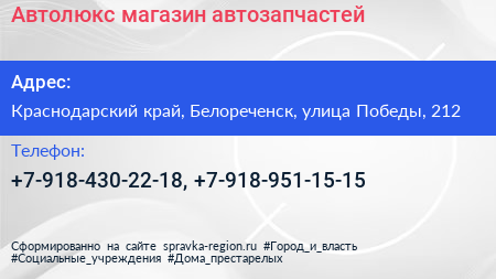 Автолюкс, магазин автозапчастей по адресу Краснодарский край, Белореченск, улица Победы, 212 в дальнейшем Организация, размещена в следующих категориях: