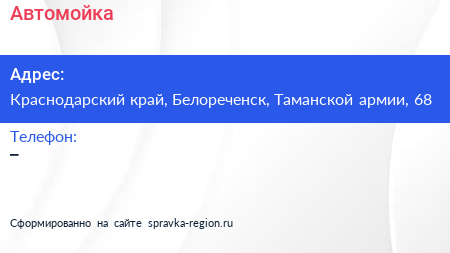 Автомойка по адресу Краснодарский край, Белореченск, Таманской армии, 68 в дальнейшем Организация, размещена в следующих категориях: