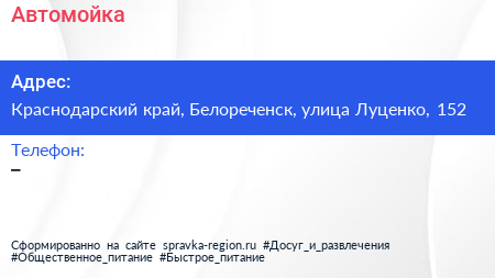 Автомойка по адресу Краснодарский край, Белореченск, улица Луценко, 152 в дальнейшем Организация, размещена в следующих категориях: