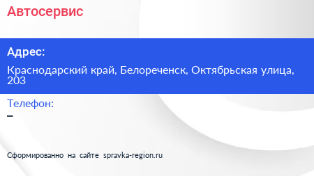 Автосервис по адресу Краснодарский край, Белореченск, Октябрьская улица, 203 в дальнейшем Организация, размещена в следующих категориях: