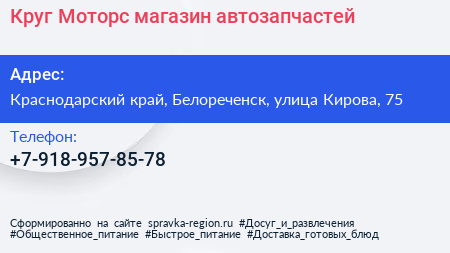 Круг-Моторс, магазин автозапчастей по адресу Краснодарский край, Белореченск, улица Кирова, 75 в дальнейшем Организация, размещена в следующих категориях: