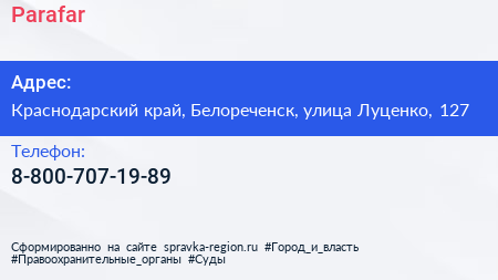 Parafar по адресу Краснодарский край, Белореченск, улица Луценко, 127 в дальнейшем Организация, размещена в следующих категориях: