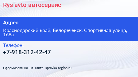 Rys avto, автосервис по адресу Краснодарский край, Белореченск, Спортивная улица, 168а в дальнейшем Организация, размещена в следующих категориях: