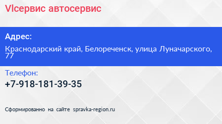 Vlсервис, автосервис по адресу Краснодарский край, Белореченск, улица Луначарского, 77 в дальнейшем Организация, размещена в следующих категориях:
