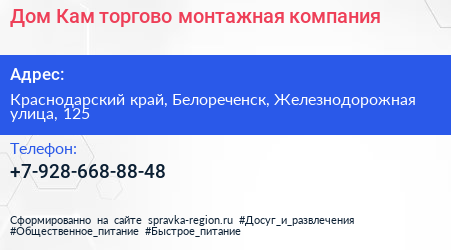 Дом-Кам, торгово-монтажная компания по адресу Краснодарский край, Белореченск, Железнодорожная улица, 125 в дальнейшем Организация, размещена в следующих категориях: