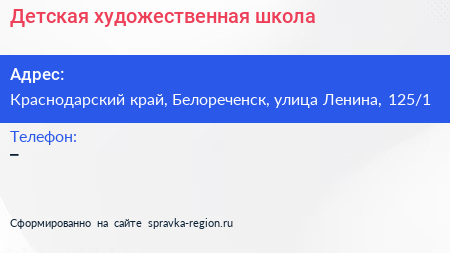Детская художественная школа по адресу Краснодарский край, Белореченск, улица Ленина, 125/1 в дальнейшем Организация, размещена в следующих категориях: