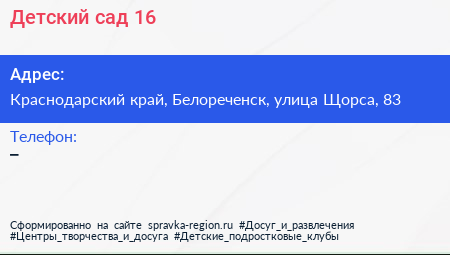 Детский сад №16 по адресу Краснодарский край, Белореченск, улица Щорса, 83 в дальнейшем Организация, размещена в следующих категориях: