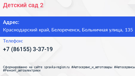 Детский сад №2 по адресу Краснодарский край, Белореченск, Больничная улица, 135 в дальнейшем Организация, размещена в следующих категориях: