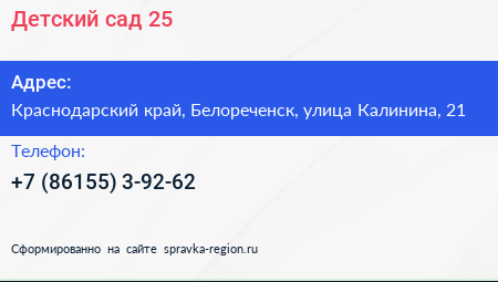 Детский сад №25 по адресу Краснодарский край, Белореченск, улица Калинина, 21 в дальнейшем Организация, размещена в следующих категориях: