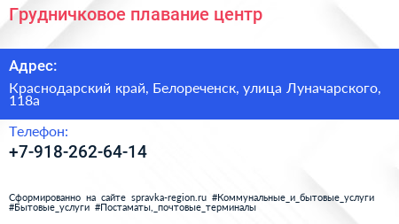 Грудничковое плавание, центр по адресу Краснодарский край, Белореченск, улица Луначарского, 118а в дальнейшем Организация, размещена в следующих категориях:
