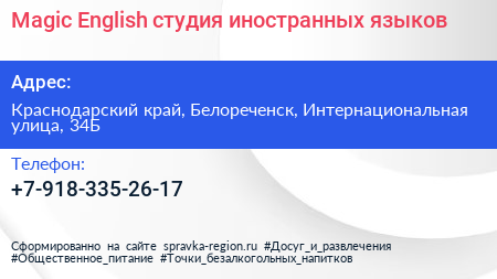 Magic English, студия иностранных языков по адресу Краснодарский край, Белореченск, Интернациональная улица, 34Б в дальнейшем Организация, размещена в следующих категориях: