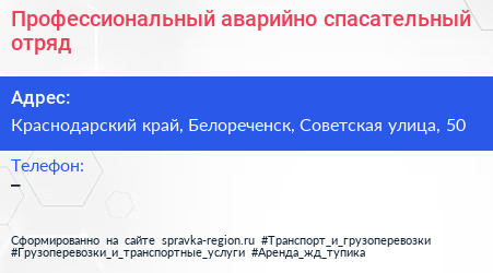 Профессиональный аварийно-спасательный отряд по адресу Краснодарский край, Белореченск, Советская улица, 50 в дальнейшем Организация, размещена в следующих категориях: