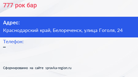 777, рок-бар по адресу Краснодарский край, Белореченск, улица Гоголя, 24 в дальнейшем Организация, размещена в следующих категориях:
