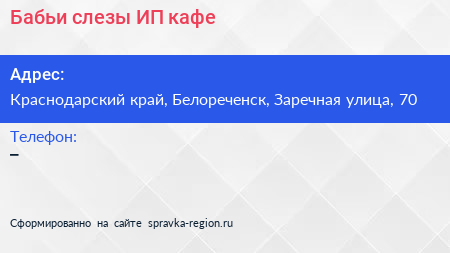 Бабьи-слезы, ИП, кафе по адресу Краснодарский край, Белореченск, Заречная улица, 70 в дальнейшем Организация, размещена в следующих категориях: