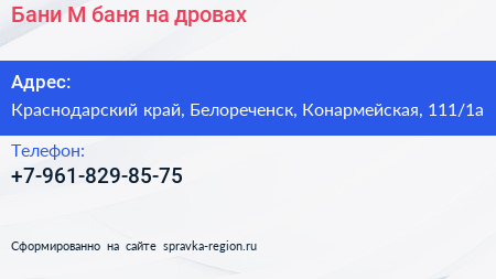 Бани М, баня на дровах по адресу Краснодарский край, Белореченск, Конармейская, 111/1а в дальнейшем Организация, размещена в следующих категориях: