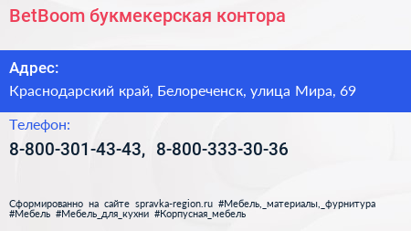 BetBoom, букмекерская контора по адресу Краснодарский край, Белореченск, улица Мира, 69 в дальнейшем Организация, размещена в следующих категориях: