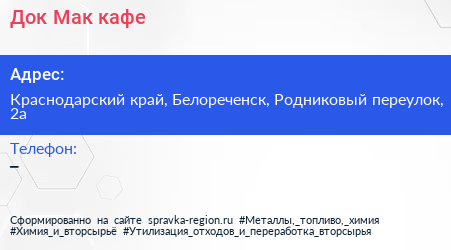 Док-Мак, кафе по адресу Краснодарский край, Белореченск, Родниковый переулок, 2а в дальнейшем Организация, размещена в следующих категориях: