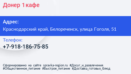 Донер №1, кафе по адресу Краснодарский край, Белореченск, улица Гоголя, 51 в дальнейшем Организация, размещена в следующих категориях: