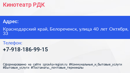 Кинотеатр РДК по адресу Краснодарский край, Белореченск, улица 40 лет Октября, 33 в дальнейшем Организация, размещена в следующих категориях: