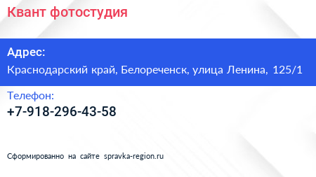 Квант, фотостудия по адресу Краснодарский край, Белореченск, улица Ленина, 125/1 в дальнейшем Организация, размещена в следующих категориях: