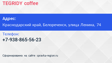 TEGRIDY coffee по адресу Краснодарский край, Белореченск, улица Ленина, 74 в дальнейшем Организация, размещена в следующих категориях: