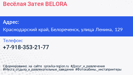 Весёлая Затея-BELORA по адресу Краснодарский край, Белореченск, улица Ленина, 129 в дальнейшем Организация, размещена в следующих категориях: