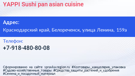 YAPPI Sushi & pan asian cuisine по адресу Краснодарский край, Белореченск, улица Ленина, 159а в дальнейшем Организация, размещена в следующих категориях: