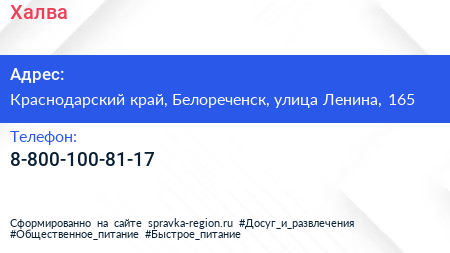 Халва по адресу Краснодарский край, Белореченск, улица Ленина, 165 в дальнейшем Организация, размещена в следующих категориях: