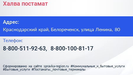 Халва, постамат по адресу Краснодарский край, Белореченск, улица Ленина, 80 в дальнейшем Организация, размещена в следующих категориях:
