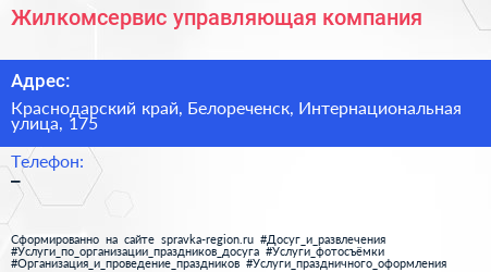 Жилкомсервис, управляющая компания по адресу Краснодарский край, Белореченск, Интернациональная улица, 175 в дальнейшем Организация, размещена в следующих категориях: