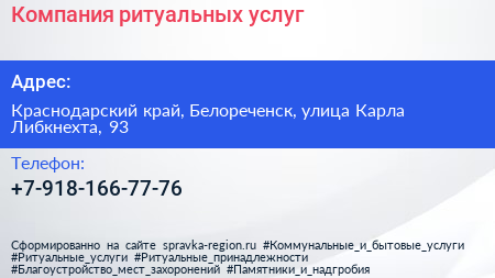 Компания ритуальных услуг по адресу Краснодарский край, Белореченск, улица Карла Либкнехта, 93 в дальнейшем Организация, размещена в следующих категориях: