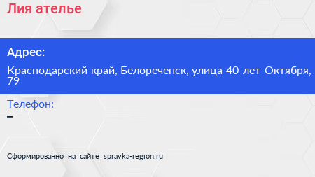 Лия, ателье по адресу Краснодарский край, Белореченск, улица 40 лет Октября, 79 в дальнейшем Организация, размещена в следующих категориях: