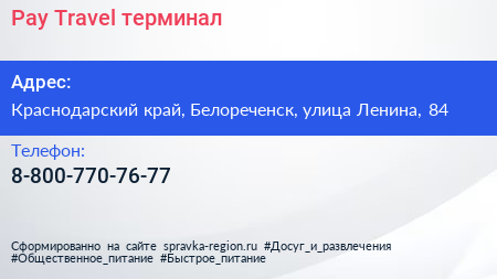 Pay.Travel, терминал по адресу Краснодарский край, Белореченск, улица Ленина, 84 в дальнейшем Организация, размещена в следующих категориях: