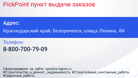 PickPoint, пункт выдачи заказов по адресу Краснодарский край, Белореченск, улица Ленина, 84 в дальнейшем Организация, размещена в следующих категориях: