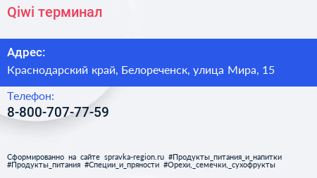 Qiwi, терминал по адресу Краснодарский край, Белореченск, улица Мира, 15 в дальнейшем Организация, размещена в следующих категориях: