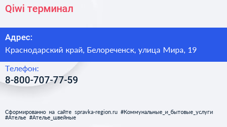 Qiwi, терминал по адресу Краснодарский край, Белореченск, улица Мира, 19 в дальнейшем Организация, размещена в следующих категориях: