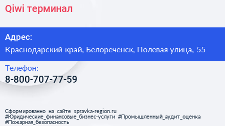 Qiwi, терминал по адресу Краснодарский край, Белореченск, Полевая улица, 55 в дальнейшем Организация, размещена в следующих категориях: