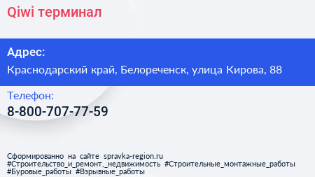 Qiwi, терминал по адресу Краснодарский край, Белореченск, улица Кирова, 88 в дальнейшем Организация, размещена в следующих категориях: