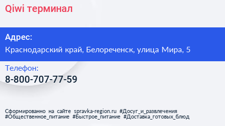 Qiwi, терминал по адресу Краснодарский край, Белореченск, улица Мира, 5 в дальнейшем Организация, размещена в следующих категориях: