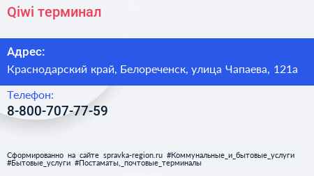 Qiwi, терминал по адресу Краснодарский край, Белореченск, улица Чапаева, 121а в дальнейшем Организация, размещена в следующих категориях: