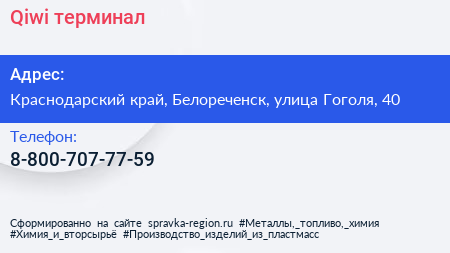 Qiwi, терминал по адресу Краснодарский край, Белореченск, улица Гоголя, 40 в дальнейшем Организация, размещена в следующих категориях:
