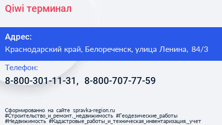 Qiwi, терминал по адресу Краснодарский край, Белореченск, улица Ленина, 84/3 в дальнейшем Организация, размещена в следующих категориях: