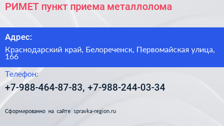 РИМЕТ, пункт приема металлолома по адресу Краснодарский край, Белореченск, Первомайская улица, 166 в дальнейшем Организация, размещена в следующих категориях:
