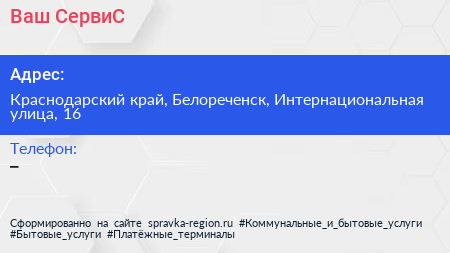 Ваш СервиС по адресу Краснодарский край, Белореченск, Интернациональная улица, 16 в дальнейшем Организация, размещена в следующих категориях: